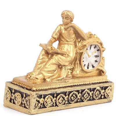 En stilig klocka med en vilande dam i guldfärg. Passar fint på spiselkransen, hyllan eller skrivbordet. Tillverkad i keramisk polyresin och handmålad - vilket betyder att alla klockor ser lite olika ut. Måtta ca 3 cm