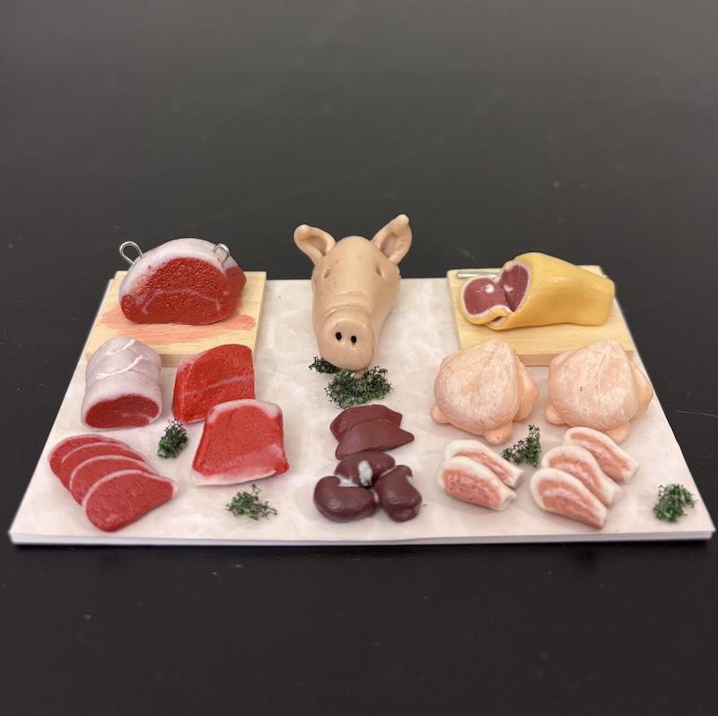 En mycket fin, detaljrik och välgjord display av kött och chark. Handgjorda och målade fiskar och skaldjur enligt bild. Alla delar sitter fast på botten. Mått själva displayen är 10 x 6,3 cm.