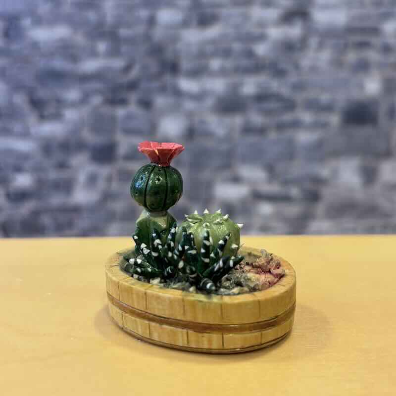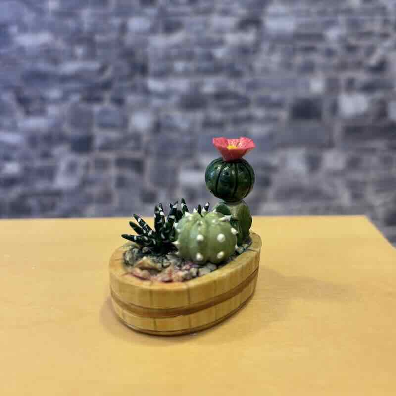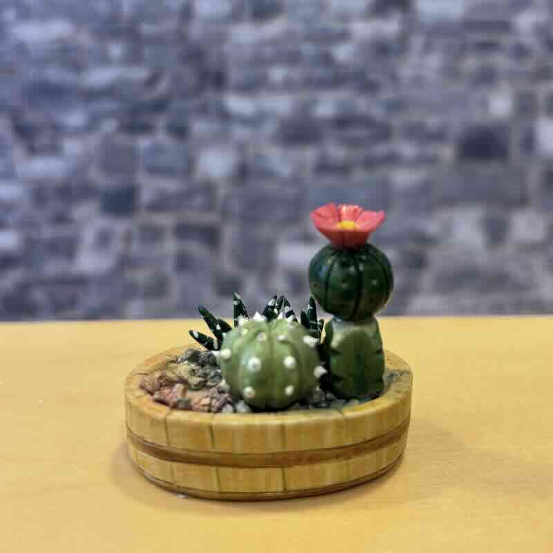 En mycket detaljerad och välgjord kruka med kaktusar i. TIllverkad i keramisk polyresin och handmålad. Mått ca B 3,3 cm x H 3,5 cm