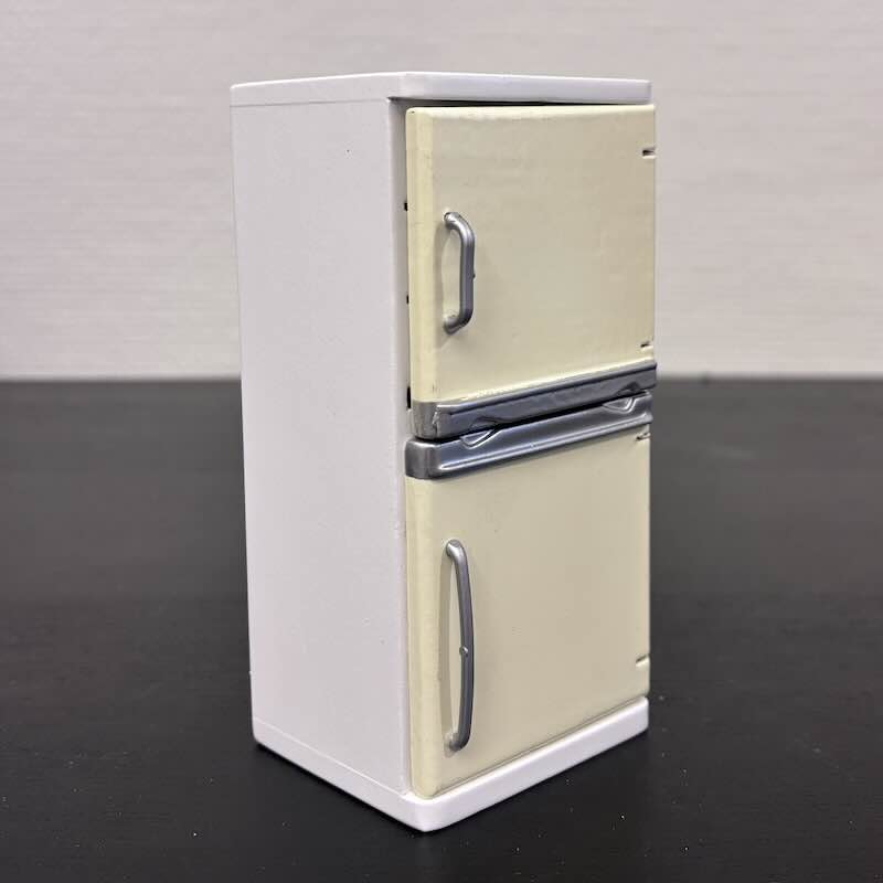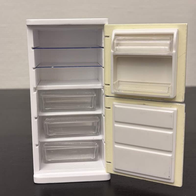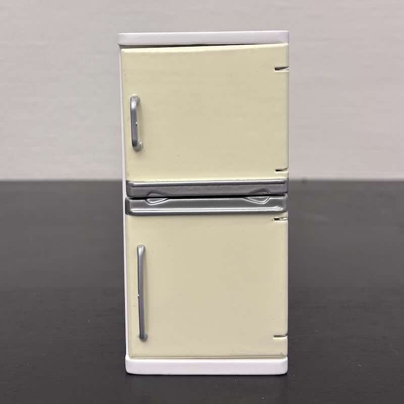 Ett kylskåp med frysdel i vit- och creme-lackerat trä. Har öppningsbara dörrar och på hyllplanen och i lådorna inne i kylskåpet kan du placera matvaror. Mått ca h 13,7 cm b 6,7 cm, d 5,6 cm.