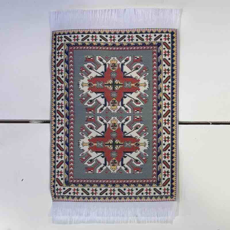 Trevlig matta i milda toner av grått rött och creme. Mått ca B 10 cm x L 15,5 cm