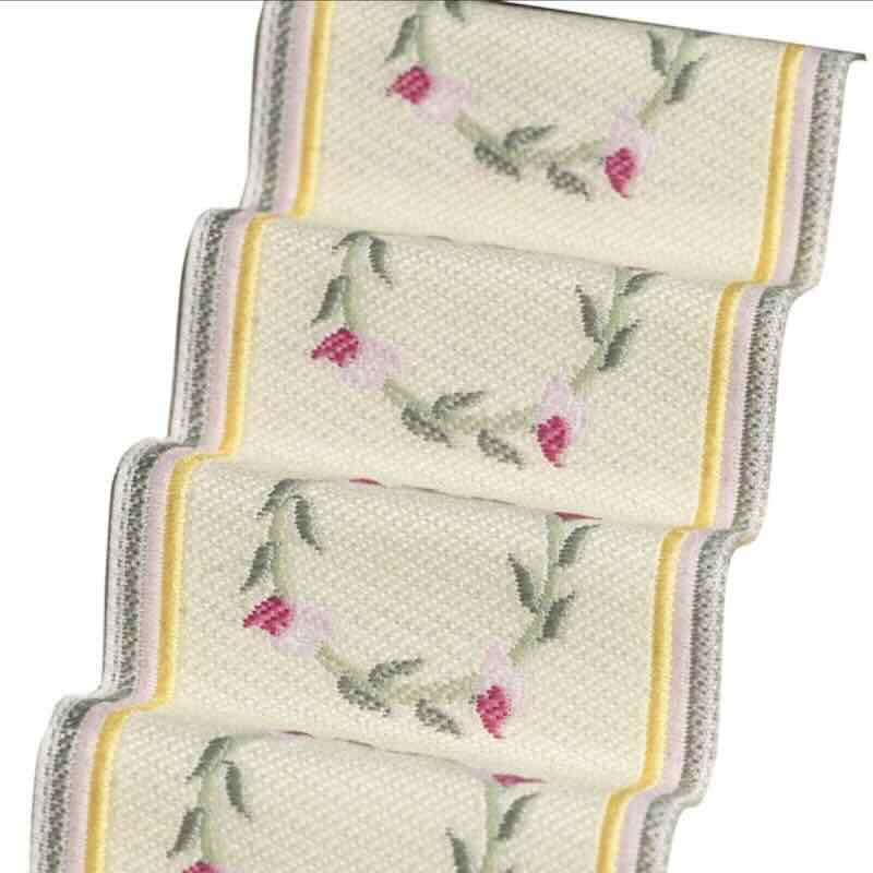 Lång och smal äkta vävd matta i textil med vackra mönster av blomkransar på en cremefärgad botten. Bilden visar en bit av mattan. Mått ca B 5 cm x L 50 cm.