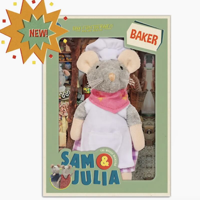 Ge liv åt berättelserna i serien "Sam och Julia" med den här musen! Lek äventyren från böcker och teve med den här söta lilla plyschmusen och ta med henne vart du än går. Den här lilla bagaren arbetar i bageriet. Varje morgon går hon upp tidigt för att knåda degen till sina underbara bröd. Sam och Julia älskar lukten av färskt bröd när de går förbi på väg till skolan.