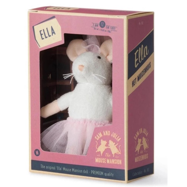 Charmiga Ella är en mjuk mus-docka, 12 cm lång som bor i sitt Mouse Mansion. Det finns även möbler i serien som du sätter samman själv. Mössen kan bo i vanliga dockhus i skala 1:12, eller så bygger du själv deras hus! Passar både stora och små, utmärkt som gemensamt projekt.