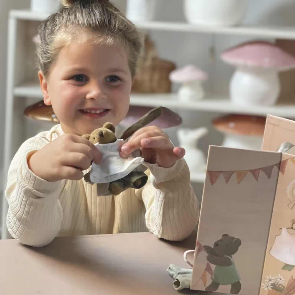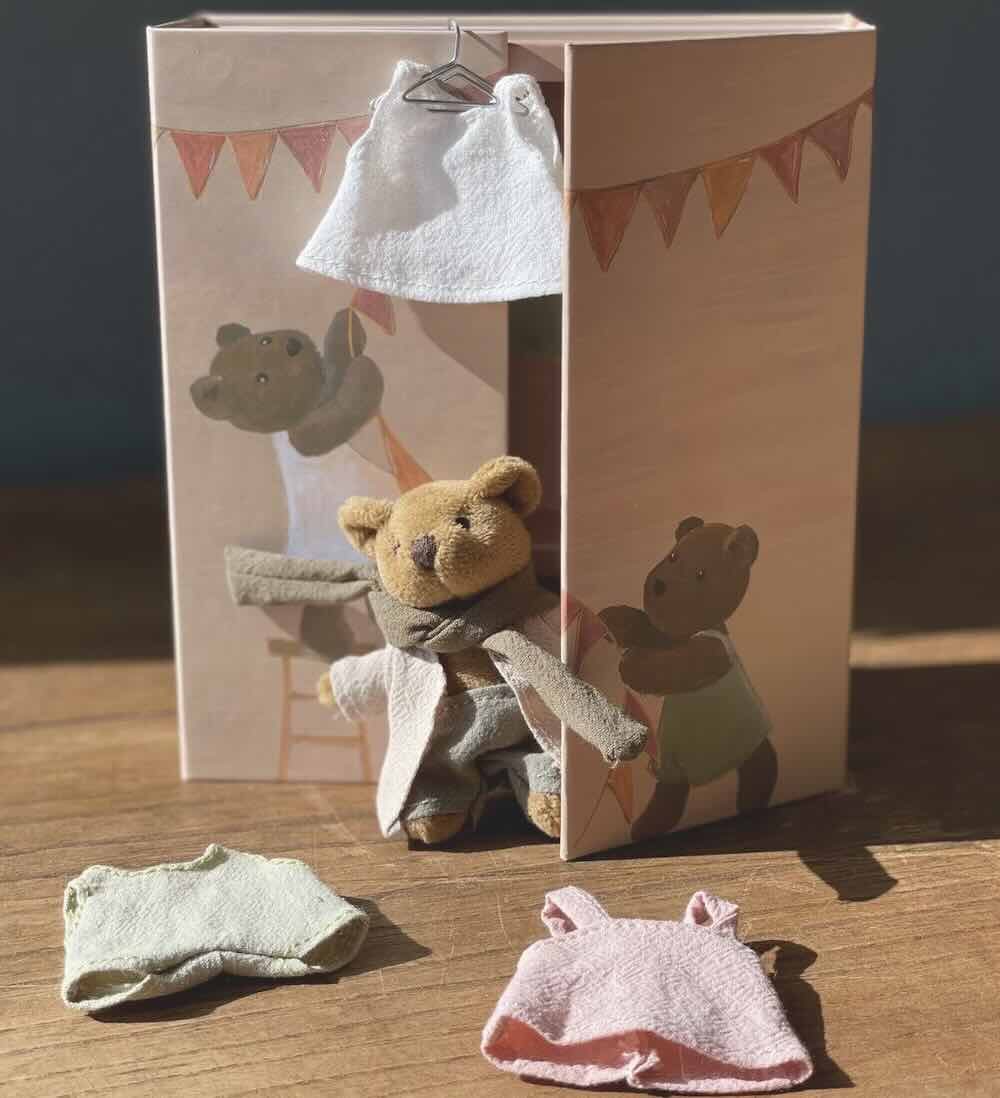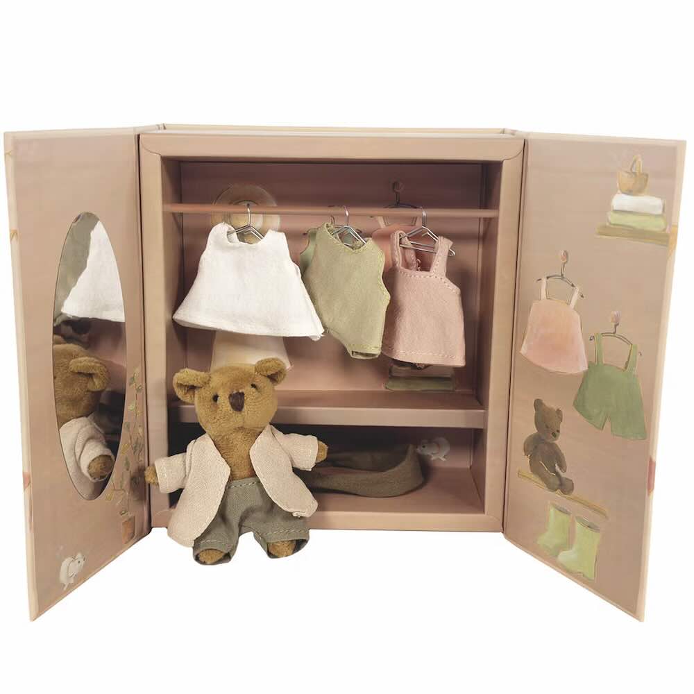 En fin liten björn med sin garderob från Egmont toys, garderoben innehåller 6 klädesplagg och 8 galgar. Hur kommer björnen klä sig idag? Från 4 år.