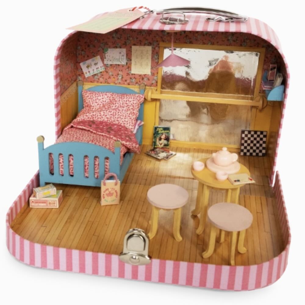 Ta med Ella överallt i denna roliga resväska. Självklart monterar du balettrummet själv - med hjälp av trädelarna och dekorationerna. Resväskan är tryckt med tapeter och ett golv. Det är bara att sätta ihop möblerna och måla dem i dina favoritfärger (färg ingår ej). Dessutom flera fina små detaljer. Denna väska är designad av Karina Schaapman, skaparen av Mouse Mansion och serien Sam och Julia på SVT barnkanalen
