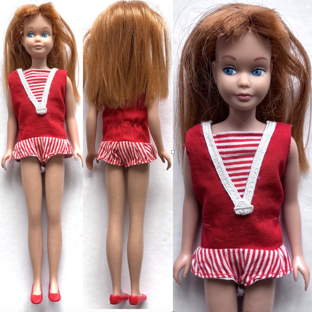 Söt Skipper i originalbaddräkt och röda skor märkta Japan. Skipper är i bra lekt skick, men behöver friseras lite. Hon har inget skav eller missfärgningar i ansikte eller på kroppen. Möjligen lättare ytsmuts efter årens gång, inga bitskador eller annat. Håret är blankt och tjockt och kommer bli vackert efter en enklare spa-behandling. Resåren på baddräkten uttänjda vid låren som synes, för övrigt klara färger.