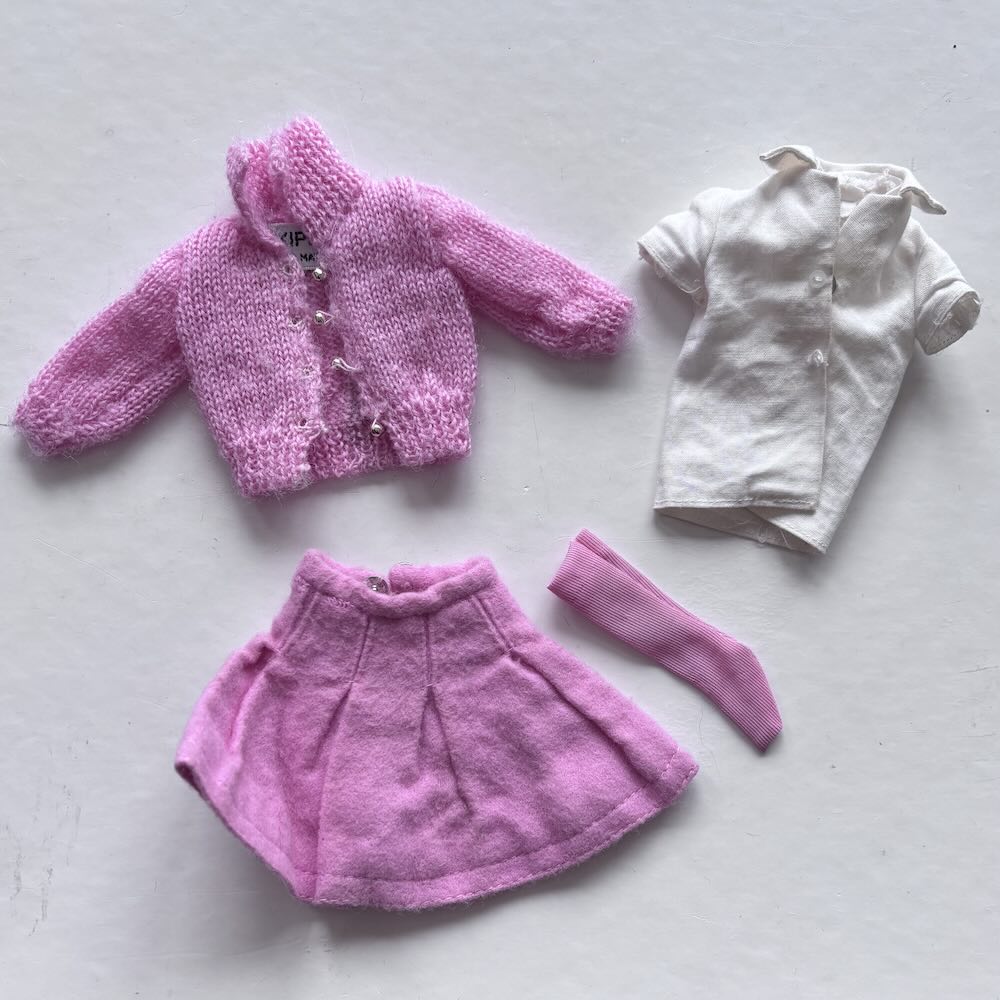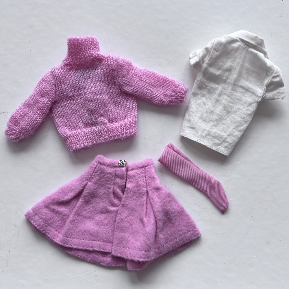 Kofta, blus, kjol och en strumpa ur setet Skipper #1907 School Days från 1963-1964 i fint lekt skick. Utan synliga skador eller fläckar, ev behöver knapparna på koftan fästas lite mer. Färgerna på plaggen ser fina ut.