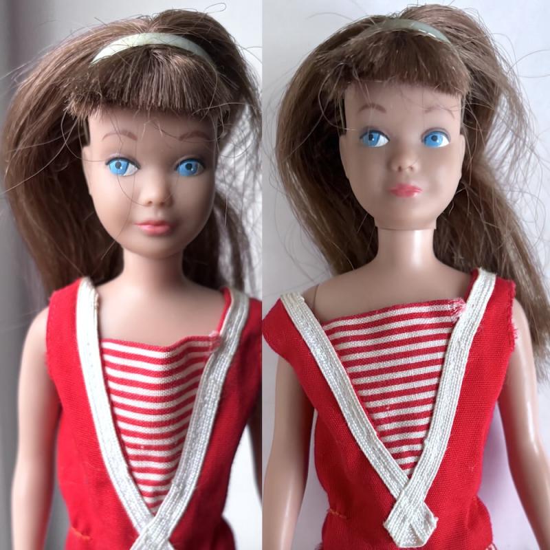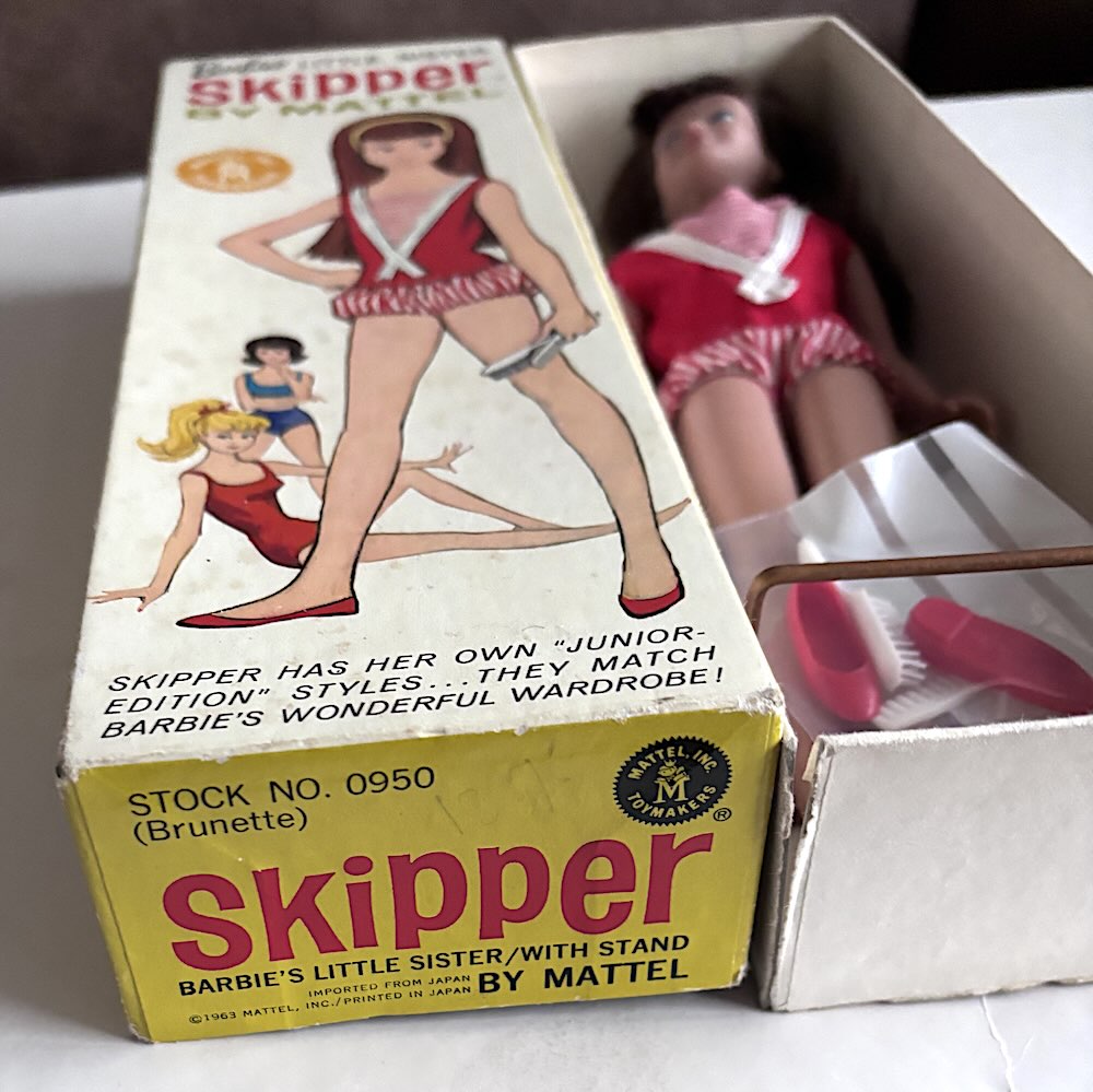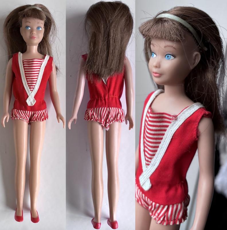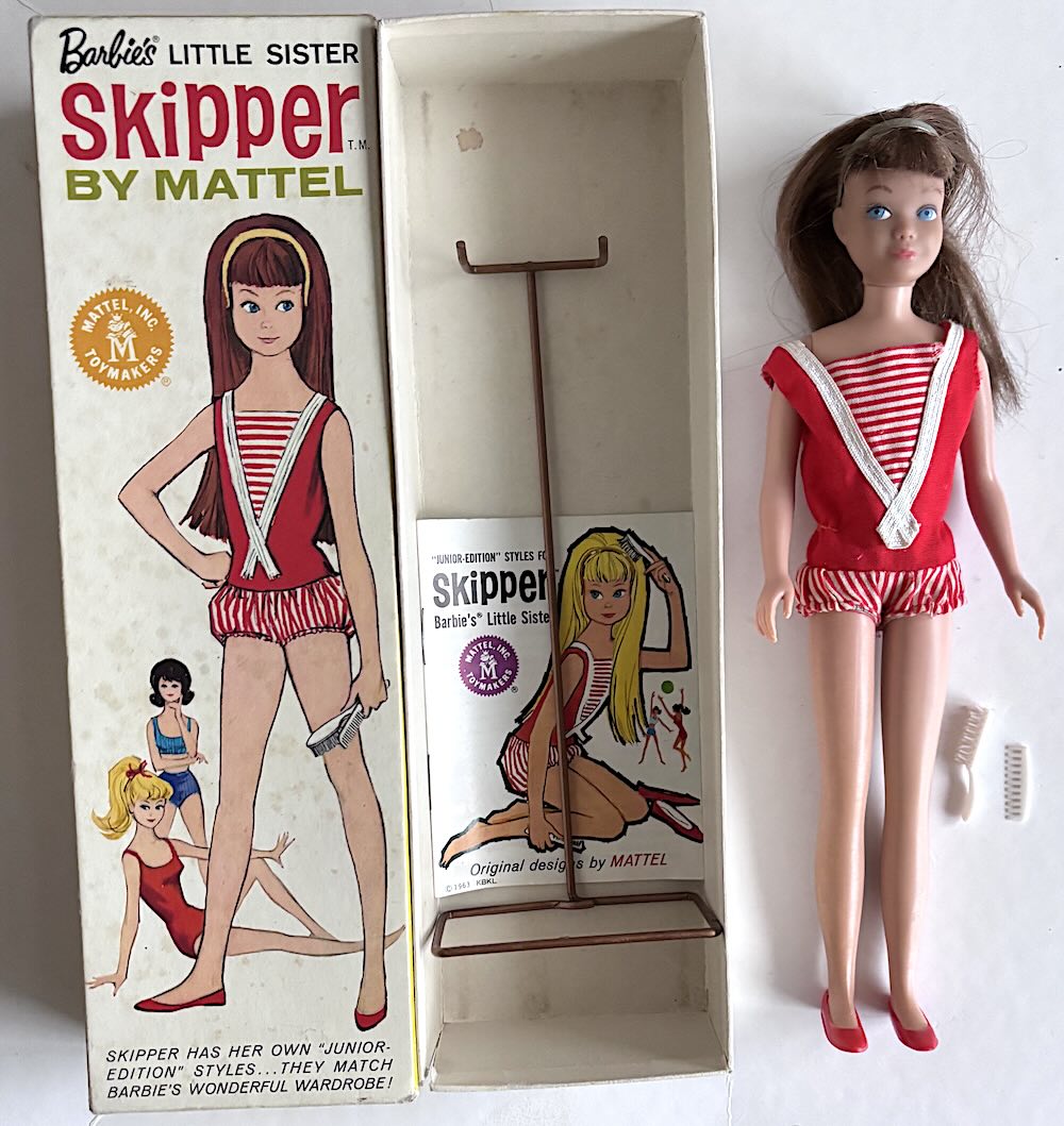 Söt brunett Skipper i fint lekt skick. Ansiktsmålning utan skav och fint hår - behöver lite frisering, inga hål i öronen. Kroppen utmärkt utan skador eller missfärgningar. Inga skav på ansiktsmålningen. Baddräkten i fint skick och skorna märkta Japan. Har med original diadem, vit borste och kam + folder. Originalask m skav och någon rivskada/skada i hörn.