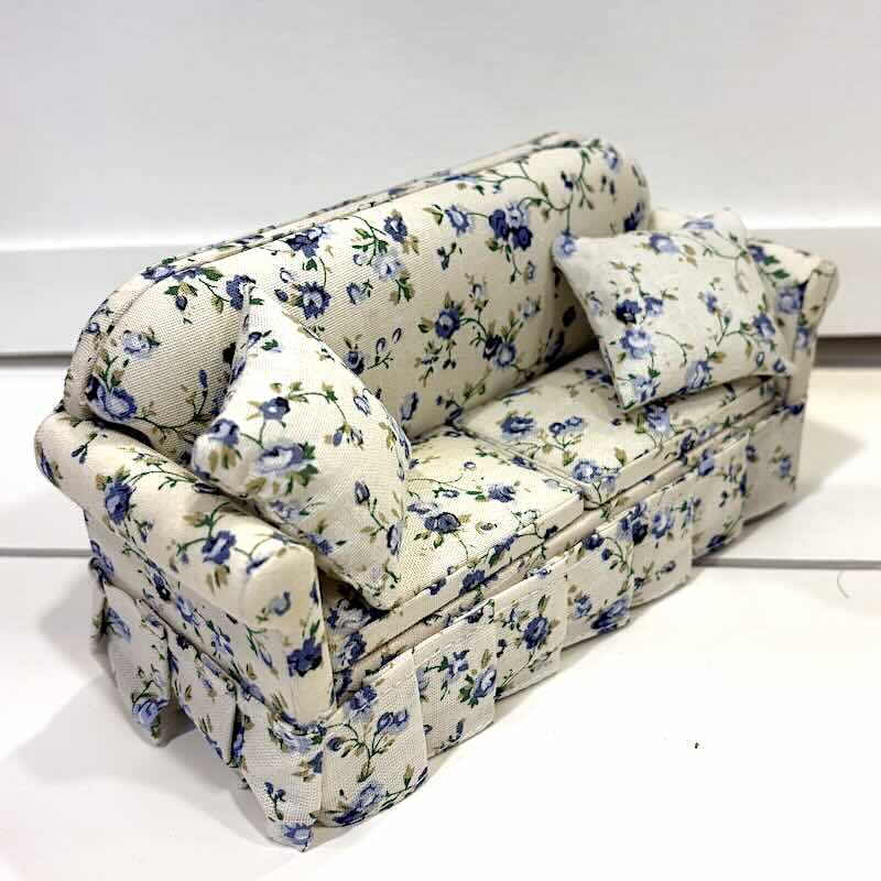 Vacker välgjord soffa i stoppad textil, med mönster av blå blommor på cremevit botten. Mått soffa ca B 16 cm x H 8 cm. Matchande fåtölj >>
