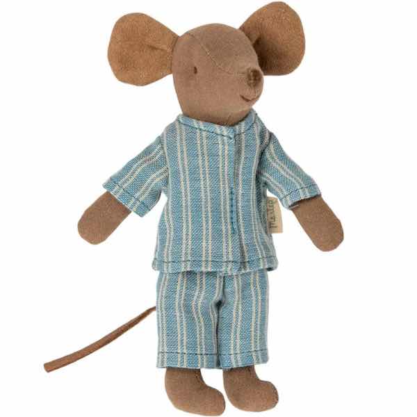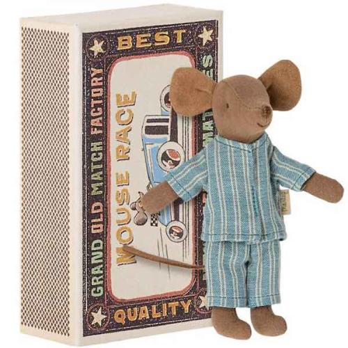 Storebror mus kommer iklädd pyamas, redo att sova i sin tändsticksask. Pyamasen är avtagbar. Tändsticksasken har ett mysigt bäddset. Mått ca Storebror längd 13 cm. Asken mäter L 15cm x B 8 cm. Passar från 3 år.