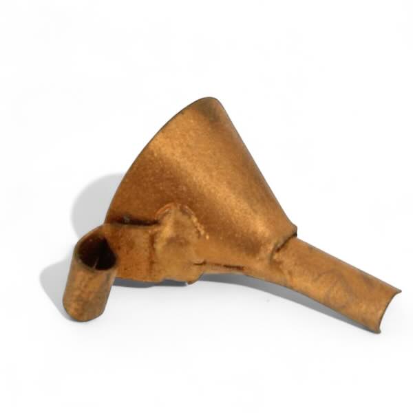 Liten tratt i skala 1:12, tillverkad i kopparfärgad metall. Mått ca L 1,9 cm