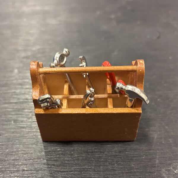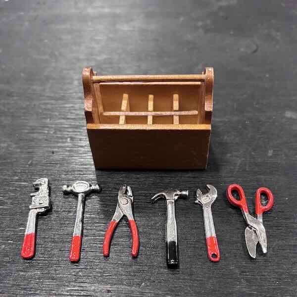 Fint set med verktygslåda i trä med 8 fack och tillhörande 6 st verktyg i metall. Saxen och tången går att röra. Mått t ex skiftnyckeln ca L 2,8 cm, verktygslådan mäter ca L 4,2 cm x B 2,5 cm.